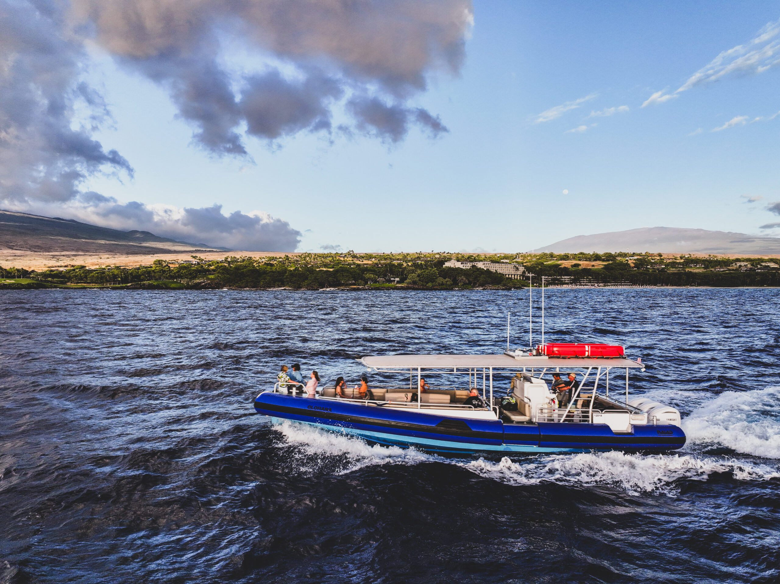Get ready for an unforgettable ocean adventure as we set off from Kawaihae Harbor on our custom-built 41′ RHIB (Rigid Hull Inflatable Boat) Olohana — designed for comfort, speed, and an up-close experience with the stunning Hawaiian coastline!