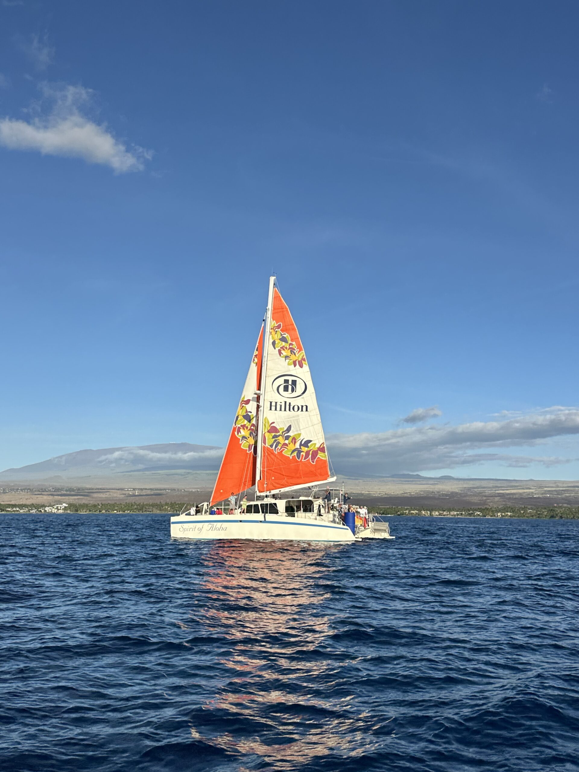The No Wiki — meaning “The Quick One” in Hawaiian — is a sleek 51-foot sailing catamaran designed for fast, fun, and comfortable adventures along the Big Island’s Kona’s beautiful coastline. With spacious seating, shaded areas, and a smooth ride, this versatile vessel is perfect for snorkeling, dolphin watching, and whale watching (in season).