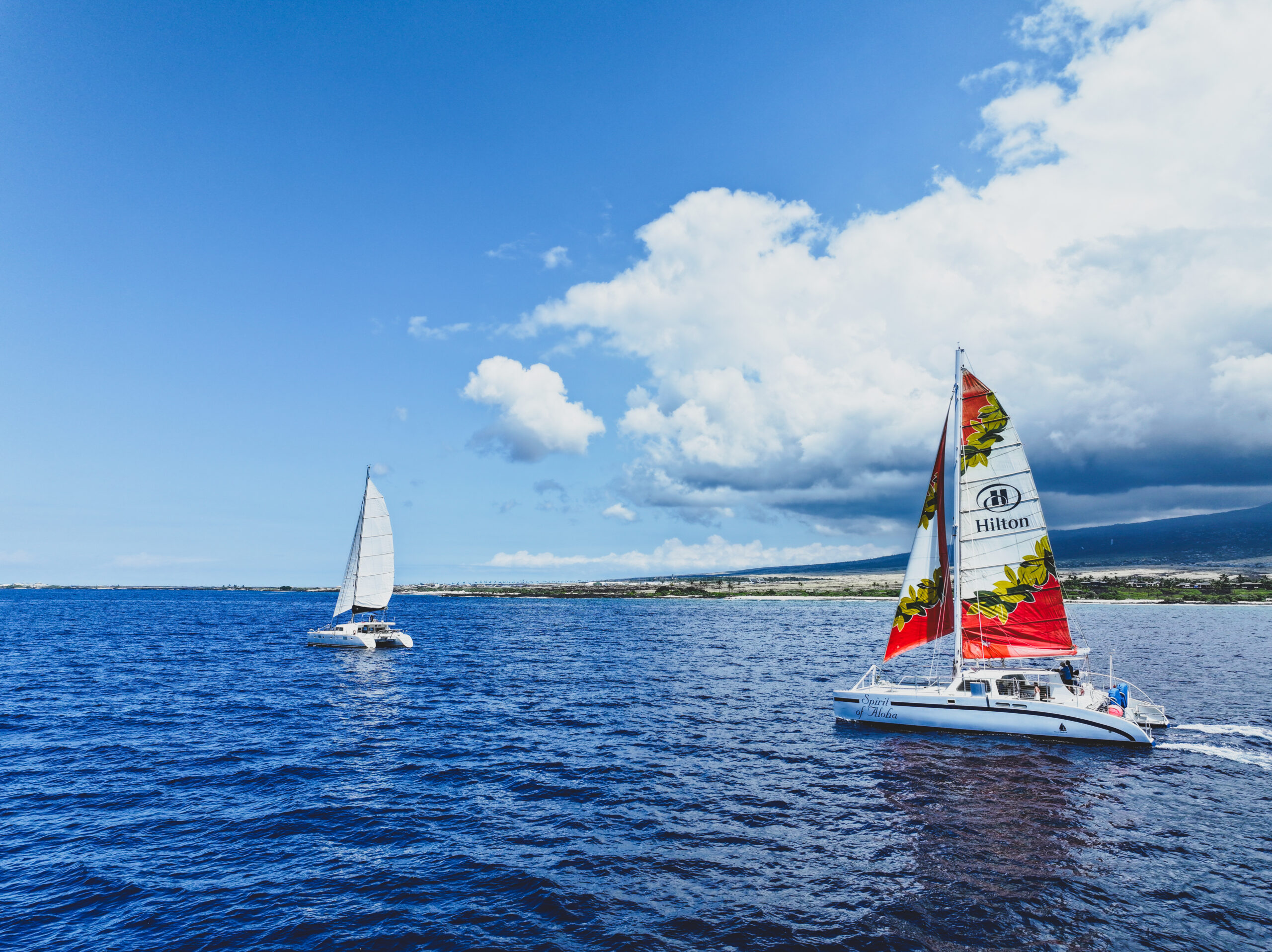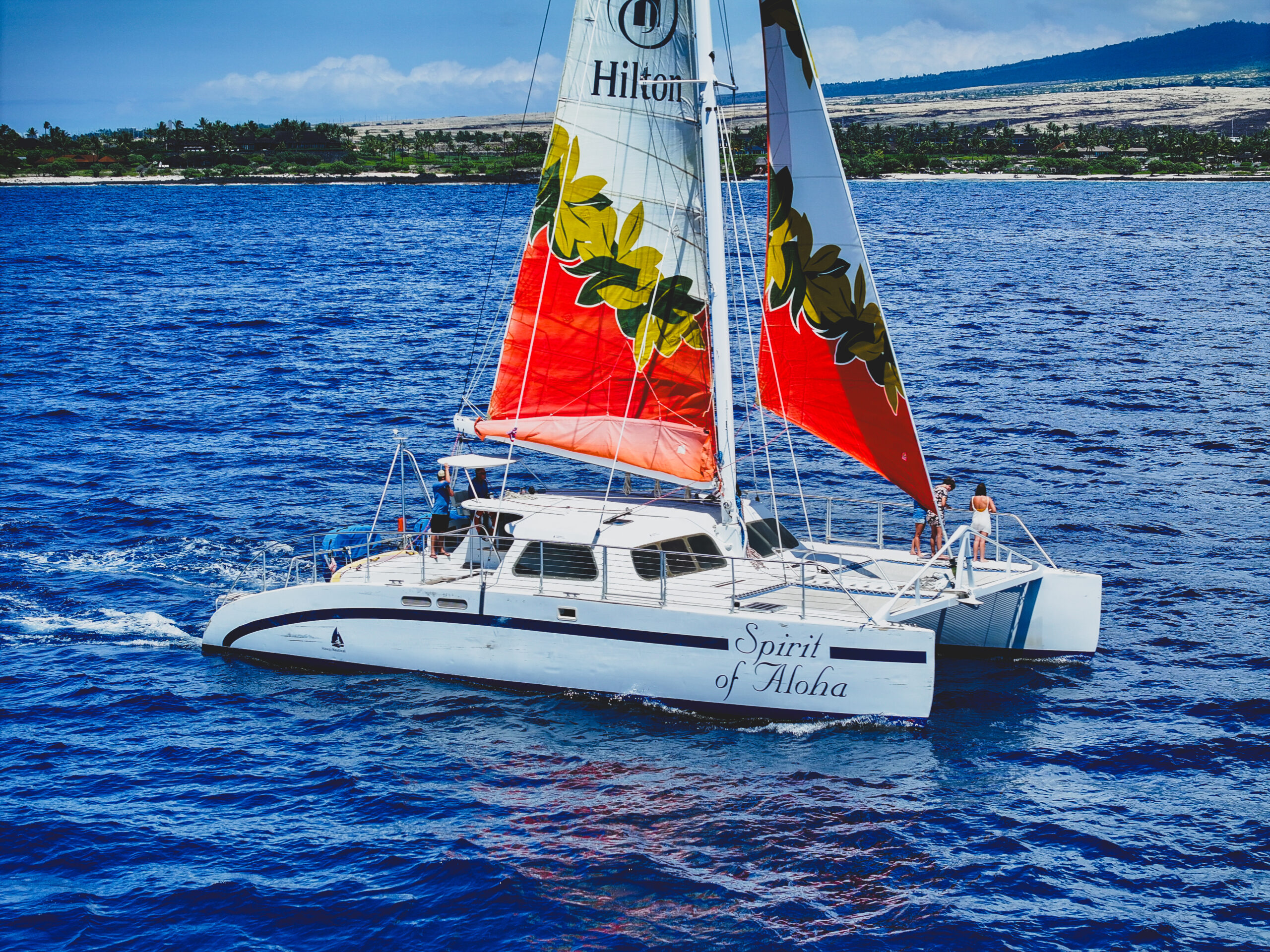 Experience the beauty of the Kona Coast from a new perspective aboard the Spirit of Aloha sailing catamaran. Feel the tradewinds fill the sails as you glide across the water, taking in panoramic views of volcanic cliffs, sparkling blue seas, and the Big Island’s rugged shoreline.