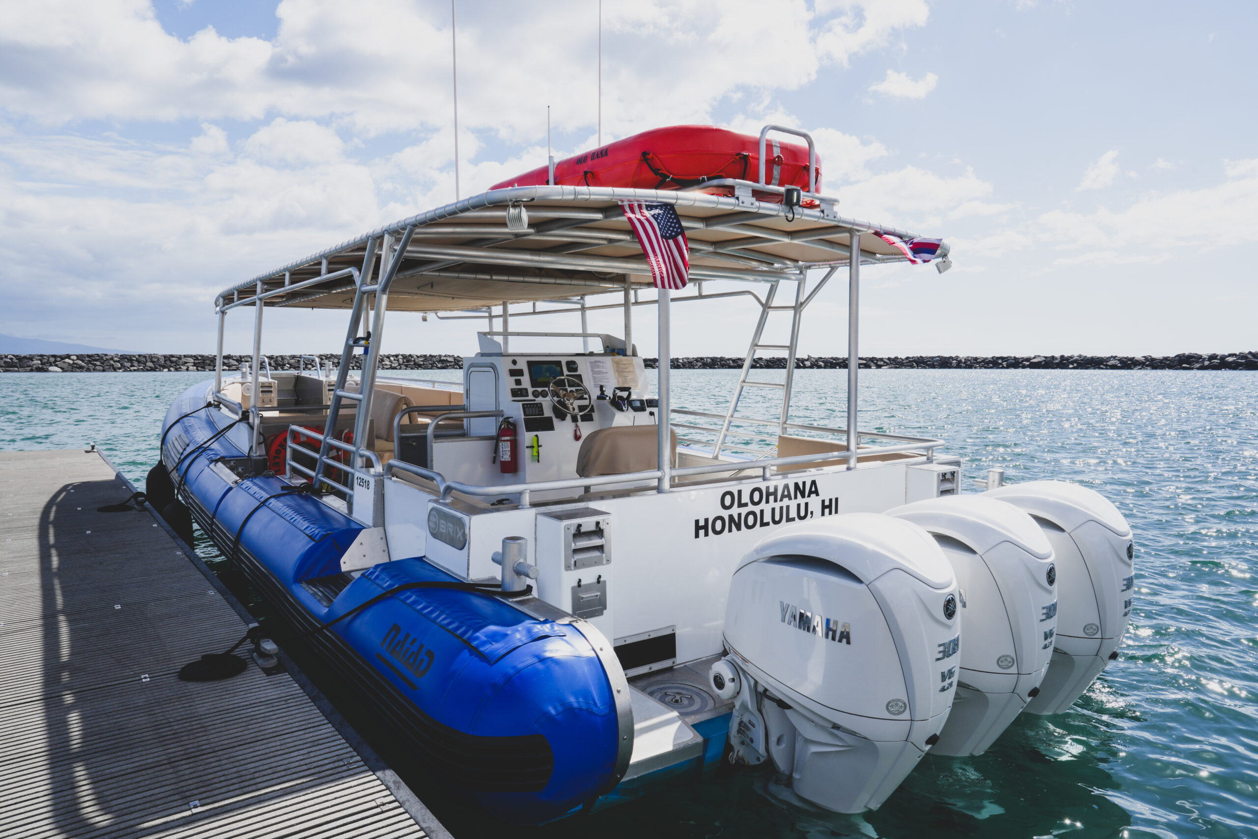 Olohana boards directly from a dock, offering easy, step-on access — perfect for families and guests who prefer not to board from the beach.