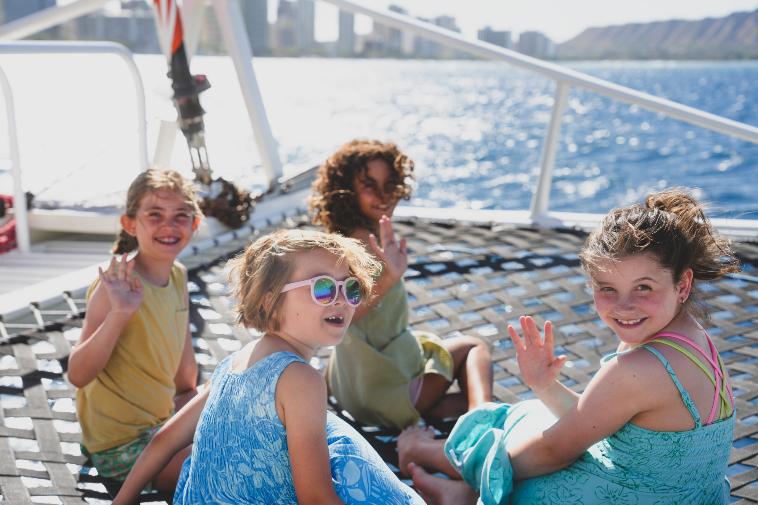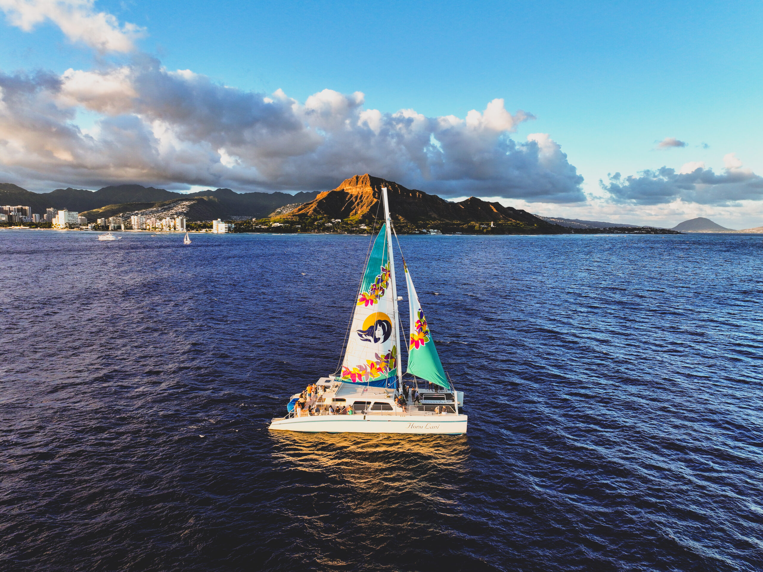 Departing from Kewalo Harbor—just minutes from Waikīkī and Ala Moana—step aboard our spacious 65’ sailing catamaran, complete with comfortable seating, onboard bathrooms, and a full bar.